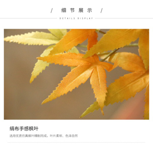 仿真紅楓樹造型,室內外通用。 材質為實木樹干、油絹布花葉。 仿真度高,環(huán)保耐用。